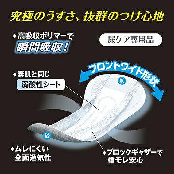 ●ブロックギャザーとフロントワイド形状でモレを徹底ガード ●素肌と同じ弱酸性シートで肌トラブルのリスクに配慮 ●消臭トリプル効果で臭いも安心 ●男性が持ち歩きやすいスタイリッシュなデザイン。