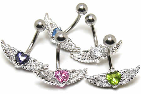 エンジェルハートへそピアス 14ゲージ 14G ヘソピアス 臍ピアス メンズ レディース ボディピアス ボディーピアス サージカルステンレス316L バナナバーベル カーブバーベル 低アレルギー ジルコニア ラインストーン ネイブル ハート 翼 ウイング 羽 可愛い