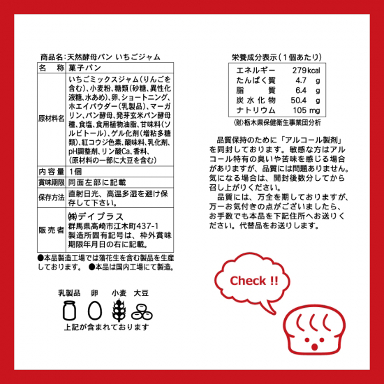 原材料/いちごミックスジャム(りんごを含む)、小麦粉、砂糖、殺菌液全卵、マーガリン、ホエーパウダー(乳製品)、果糖ブドウ糖液糖、イースト、発芽玄米パン酵母種、トレハロース、食塩、甘味料(ソルビトール)、増粘多糖類、着色料(紅麹、カロテン)、酸味料、リン酸三Ca、pH調整剤、乳化剤、香料(原材料の一部に大豆、りんごを含む) 成分(1個あたり)/エネルギー 279kcal たんぱく質 4.7g 脂質 6.4g 炭水化物 50.4g ナトリウム 105mg